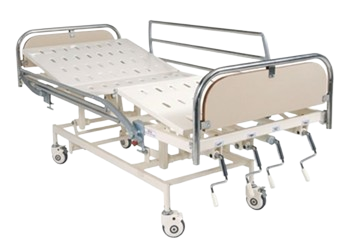 • Two Pieces individual detachable side rails, Stainless steel. Stainless Steel Head and Foot Panel with laminated board. • Frame work made of Rectangular M.S. Tube. 4 section top made up of Oval perforated CRCA MS Sheet. • Bed Mounted on 5" diameter Castor, 2 with brakes. Holder for Urine bag. S.S. Telescopic IV Rod with Locations. • Overall Approx. Size: 2090L x 910W x 460-700H MM. • Finish: Pretreated & Epoxy Powder Coated. Positions obtained by Smooth Crank System with foldable handles.